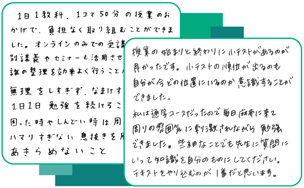 麻布デンタルアカデミーの国試対策コースで歯科医師国家試験に合格した受講生のみなさんに、直筆で合格体験記を書いていただきました。