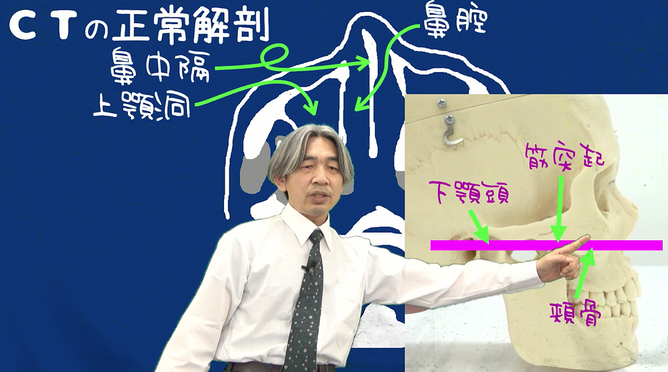 CT、MRIで、撮影した映像は、どの部分なのか?断面の撮影映像モデルやと頭蓋骨の模型を比べながら、解説します。